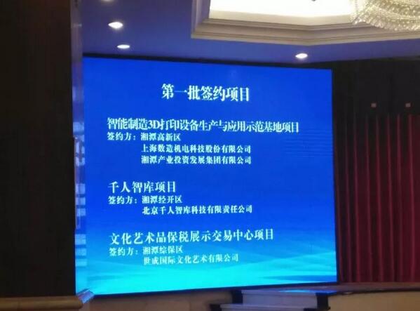 會議的簽約儀式中,上海數(shù)造機電科技股份有限公司作為第一家簽約公司,將在湘潭市高新區(qū)智造谷,成立3D打印設備生產(chǎn)及示范應用基地(擬成立湖南數(shù)造公司),總投資為3000萬元。將以3D打印設備生產(chǎn)、3D掃描及打印服務、3D設備應用示范、3D學院(3D教育)、行業(yè)云平臺服務為主要職能。